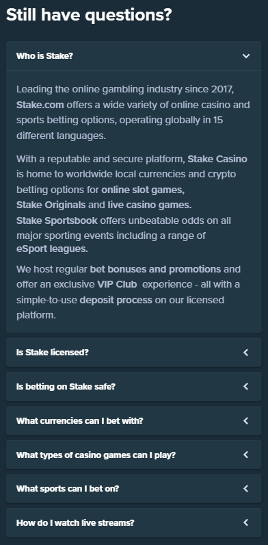 Stake’s live chat option is an actual time avenue that allows a user to interact by relaying answers to questions concurrently.